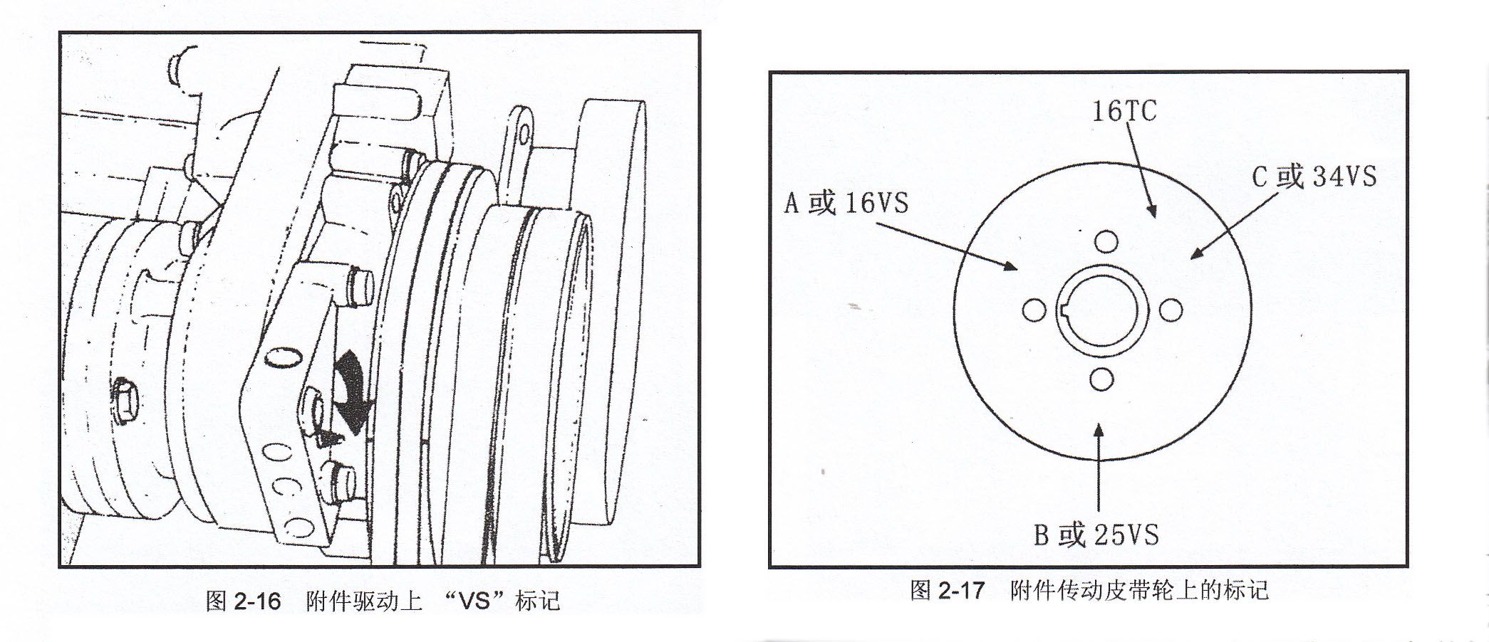 1、撬動發(fā)動機直到皮帶輪上“A”或1-6“VS”標記和齒輪室蓋上箭頭對準,見圖2-16和圖2-17。在這位置上,第五缸的兩個氣門搖臂都是可以自由活動的(氣門都在關(guān)閉狀態(tài))。第三缸噴油器柱塞在行程頂端如不是這樣,再將發(fā)動機撬轉(zhuǎn)3600,重新對準標記和箭頭。