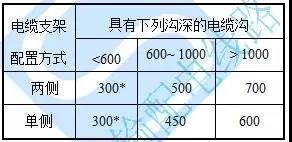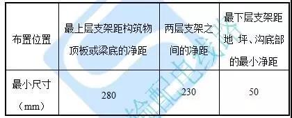 e)水平敷設(shè)時(shí)電纜支架的最上層、最下層及兩層之間布置尺寸,應(yīng)不小于下表所列值。