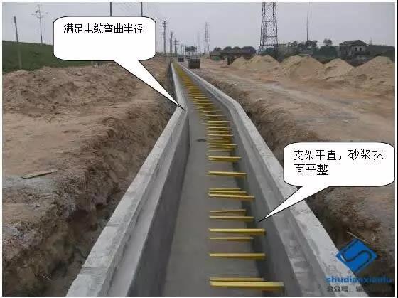 (10)磚砌電纜溝溝壁磚砌灰縫必須飽滿,砂漿強(qiáng)度達(dá)到設(shè)計(jì)強(qiáng)度的70%后才允許砂漿抹面。電纜溝長度超過50米時(shí),砌體及壓梁應(yīng)設(shè)置伸縮縫。內(nèi)壁及溝底用1:2水泥防水砂漿(摻5%水泥重量防水劑)批擋抹面15厚,宜分兩層抹面并壓光。