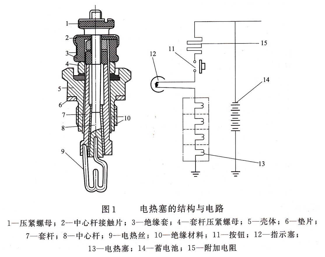 一般在采用渦流式或預燃式燃燒室的柴油機中裝有電熱塞,以便在啟動時對燃燒室內的空氣進行預熱。螺旋形的電阻絲一端焊于中心螺桿上,另一端焊在耐高溫不銹鋼制造的發熱缸套底部,在鋼套內裝有具有一定絕緣性能、導熱好和耐高溫的氧化鋁填充劑。各電熱塞中心螺桿用導線并聯,并連接蓄電池上。在柴油機啟動以前,先用專用的開關接通電熱塞電路,很快發熱的鋼套使氣缸內的空氣溫度升高,從而提高了壓縮終了時的空氣溫度,使噴入氣缸內的柴油著火容易。