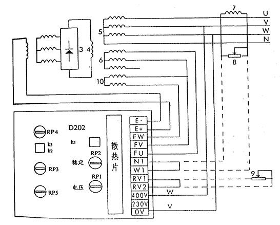 測(cè)量變壓器輸入電壓為400伏(也可為230伏),短路和過(guò)載保護(hù)的快速熔斷10A,5秒(此容斷器裝在調(diào)節(jié)器線路板上)。需要有負(fù)載緩沖功能和U/f=常數(shù)功能時(shí),K3開(kāi)關(guān)置于“ON”位置,不需這兩項(xiàng)功能時(shí),K3開(kāi)關(guān)置于“斷開(kāi)”位置。 需要遠(yuǎn)程電壓調(diào)節(jié)時(shí),可將RV1和RV2之間的短路接線斷開(kāi),接入一個(gè)KΩ的電位器(推薦用多圈電位器)。N1,W1出廠時(shí)被短接,如有并聯(lián)運(yùn)行要求,折去短接線,在此二端接上調(diào)差裝置(該裝置由一個(gè)電流互感器和一個(gè)電位器并聯(lián)接而組成)。電流互感器付邊容量為1VA,電流為1A,電位器為20W5Ω。注意,調(diào)差裝置的電流互感器不能與AVR的電壓測(cè)量變壓器接在同一相中,例如,AVR的電壓測(cè)變壓器接在V-W相,那么調(diào)差用的電流互感受器應(yīng)接在U相中。
