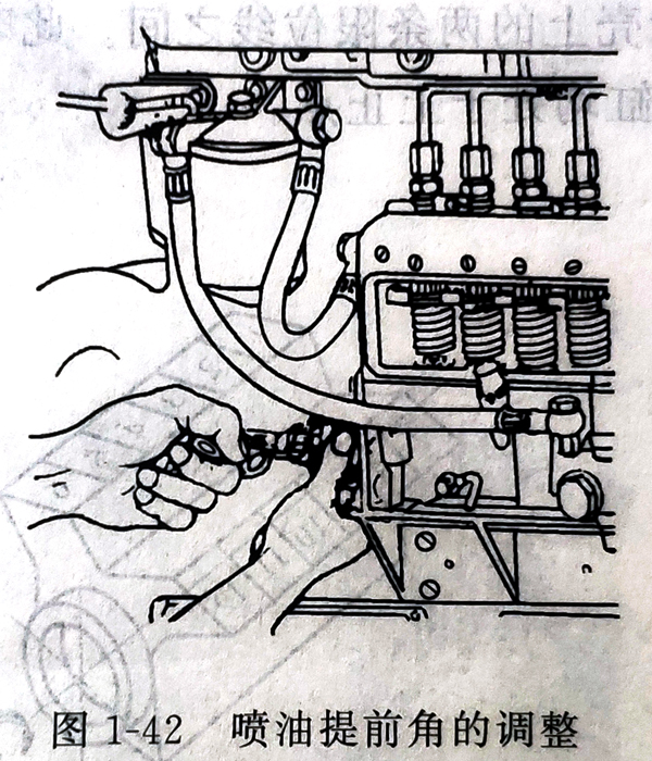 1缸出油口的油面情況。當(dāng)油面剛剛發(fā)生波動(dòng)的瞬時(shí),即表示第1缸噴油開始,此時(shí)檢視窗上指針?biāo)鶎?duì)準(zhǔn)的飛輪上刻度值就是噴油提前角度數(shù)。如這角度與規(guī)定范圍不符,可松開接合盤上的兩個(gè)螺釘,將噴油泵凸輪軸轉(zhuǎn)過所需調(diào)整的角度(傳動(dòng)軸接盤上的刻度,每個(gè)相當(dāng)于曲軸轉(zhuǎn)角3°),提前角過小,凸輪軸按運(yùn)轉(zhuǎn)方向轉(zhuǎn)動(dòng);提前角太大,則按運(yùn)轉(zhuǎn)的反方向轉(zhuǎn)動(dòng),然后擰緊接合盤上的兩個(gè)螺釘,再重復(fù)核對(duì)一次,直至符合規(guī)定范圍為止。