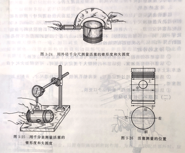 值得注意的是:測(cè)量活塞時(shí),應(yīng)在活塞裙部的上、中、下三處分別測(cè)出前后和左右的數(shù)值來(lái)(圖3-26),測(cè)得活塞縱向直徑最大值與最小值之差為錐形度,橫斷面直徑最大值與最小值之差為失圓度,然后按照說(shuō)明書技術(shù)要求進(jìn)行對(duì)照,看是否可繼續(xù)使用。