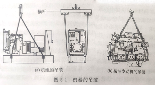 (1)機組的搬運與存放 機組及其他電氣設(shè)備一般都有包裝箱,在搬運時應(yīng)注意將起吊的鋼索結(jié)扎在機器的適當部位,輕吊輕放。為了安裝而吊起機組時,首先連接好底架上突出的升吊點,然后檢查是否已牢牢掛住,焊接處有無裂縫,螺釘是否收緊,等等。另外,最好用橫桿起吊,以防機器碰傷[如圖5-1(a)所示,吊裝的點應(yīng)在重力的中心(靠近發(fā)動機)而不是整機的中心,這樣才可以垂直吊起,一旦機器離地,就要用導(dǎo)索來防止銷絲細扭結(jié)或機器搖擺。機器放下時要放置在平坦及能承載發(fā)電機重量的地方。如果吊起發(fā)電機,應(yīng)安裝一個單點的懸吊裝置,標準有天蓋的機器已有單點懸吊裝置。柴油機的吊裝方法如圖5-1(b)所示。