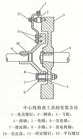 (4)轉(zhuǎn)動飛輪 使專用工具處于水平方向的左右兩側(cè)位置。用上述同樣的方法,檢查其左右(前后)方向的交錯量與偏移量,如兩軸中心線在左右(前后)方向的交錯量和偏移量超過了允許限度,應移動發(fā)電機進行校正。校正時要先校正交錯量后校正偏移量。