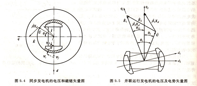 圖9.2的發(fā)電機(jī)矢量圖和式(9-1)的功角特性固然適用于單獨(dú)運(yùn)行的發(fā)電機(jī),但主要還是用于分析發(fā)電機(jī)的并聯(lián)工作。因?yàn)樵诎l(fā)電機(jī)單獨(dú)工作時(shí),從矢量圖可以看出,其功角不可能超過(guò)90o,也不可能為負(fù)值,但是當(dāng)發(fā)電機(jī)并聯(lián)運(yùn)行時(shí),情況就可能復(fù)雜得多。例如,圖9.5表示了兩臺(tái)發(fā)電機(jī)并聯(lián)運(yùn)行的情況。如前所述,它們具有共同的電壓,兩臺(tái)機(jī)組的總功率應(yīng)和負(fù)載功率相平衡,而每臺(tái)機(jī)組的功率大小則和該機(jī)組的功率角有關(guān),圖中θ1 >θ2即第一臺(tái)機(jī)組的功率P1大于第二臺(tái)機(jī)組的功率P2。按照矢量圖和式(9-1),功角差θ12反映了兩臺(tái)機(jī)組的功率差別,對(duì)于一般發(fā)電機(jī)參數(shù)來(lái)說(shuō),θ12 =20o~30o電角度,就足以使兩臺(tái)發(fā)電機(jī)的功率差別等于發(fā)電機(jī)的額定功率。由于總的負(fù)載功率是不變的,因此,一臺(tái)機(jī)組的功角(功率)增加,另一臺(tái)機(jī)組的功角必然減小,甚至成為負(fù)值。這就說(shuō)明,在分析發(fā)電機(jī)功率變化的時(shí)候,必須要和其他并聯(lián)機(jī)組的功角變化聯(lián)系起來(lái)。