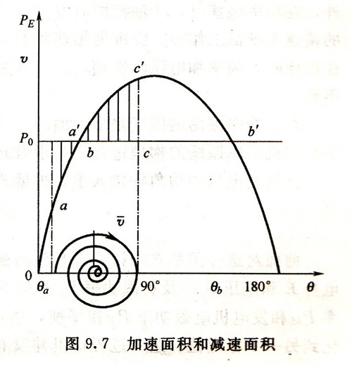 假定在短路被切除以后,某臺發(fā)電機(jī)具有圖9.7所示的功角特性,且此時發(fā)電機(jī)的功角為θa,并假定此刻發(fā)電機(jī)轉(zhuǎn)子和電網(wǎng)的電壓矢量具有相同的轉(zhuǎn)速,即相對速度v為零。則在柴油機(jī)剩余功率的作用下,發(fā)電機(jī)轉(zhuǎn)子由θa被加速,θ角逐漸增大,在到達(dá)b點以前,柴油機(jī)轉(zhuǎn)矩總是大于發(fā)電機(jī)轉(zhuǎn)矩,加速過程一直要延續(xù)到b點為止。當(dāng)θ=θb時,發(fā)電機(jī)輸出功率和柴油機(jī)功率相平衡,剩余轉(zhuǎn)矩為零,相對轉(zhuǎn)速v不再增加而達(dá)最大值。由于此時發(fā)電機(jī)轉(zhuǎn)子的轉(zhuǎn)速大于電壓矢量的轉(zhuǎn)速,發(fā)電機(jī)轉(zhuǎn)子將借助慣性越過 b 點,繼續(xù)增大θ角,但是剩余功率改變了符號,發(fā)電機(jī)轉(zhuǎn)子開始減速,直到c點,發(fā)電機(jī)的相對速度v為零,θ角達(dá)最大值,在剩余轉(zhuǎn)矩的作用下,轉(zhuǎn)子開始了相反的運動過程。發(fā)電機(jī)在加速過程中所獲得的動能可用加速面積a'ab表示,在減速過程中所消耗的動能可用減速面積bcc'表示,根據(jù)能量守恒原則,加速面積和減速面積應(yīng)該相等。很顯然,減速面積的最大值為bcb'b,如果加速面積小于這一最大值(圖9.7中所示情況),則發(fā)電機(jī)轉(zhuǎn)子在阻尼因素的作用下,經(jīng)過若干擺動之后,便可穩(wěn)定在6點,說明系統(tǒng)經(jīng)過短路這一擾動后,具有功態(tài)穩(wěn)定性;如果加速面積大于bcb'b,則發(fā)電機(jī)轉(zhuǎn)子的運動將越過6'點,柴油機(jī)的剩余轉(zhuǎn)矩再次改變符號,使發(fā)電機(jī)轉(zhuǎn)子進(jìn)一步加速,直至失去同步,因此系統(tǒng)不具備動態(tài)穩(wěn)定性。