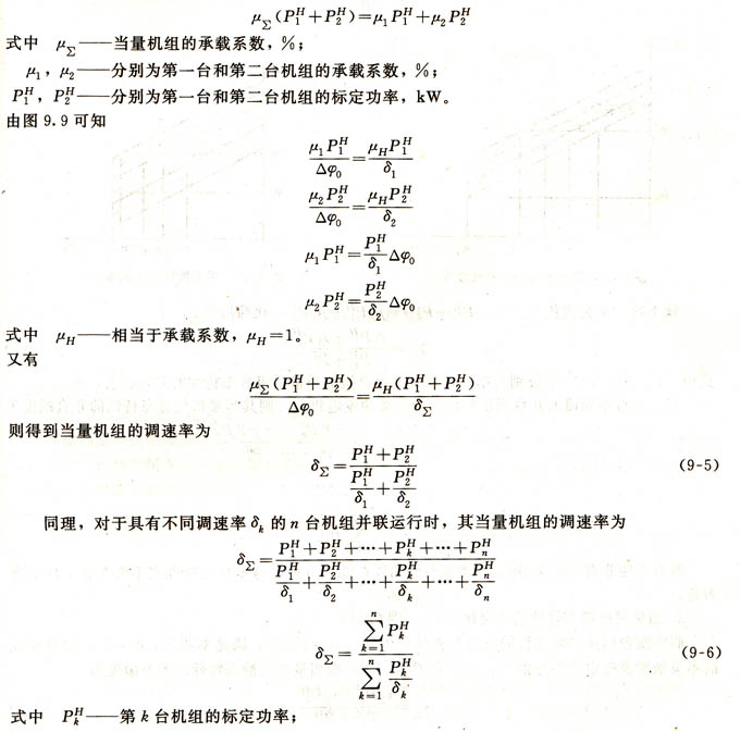 假定兩臺機(jī)組調(diào)速特性的非直線度r1 =r2=0,調(diào)速器的不靈敏度ε1=ε2 =0,調(diào)速率分別為δ1、δ2;標(biāo)定功率分別為pH 1、pH 2,則這兩臺機(jī)組并聯(lián)運(yùn)行時當(dāng)量機(jī)組的調(diào)速率計算如下。