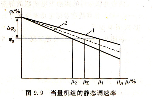 圖9.9為兩臺同步并聯(lián)運(yùn)行機(jī)組的靜特性。1為第一臺機(jī)組的特性,2為第二臺機(jī)組的特性。縱坐標(biāo)是頻率的百分比,橫坐標(biāo)是負(fù)載的百分比。