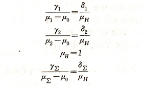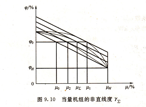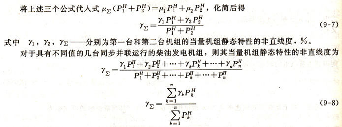 兩臺并聯(lián)運(yùn)行的柴油發(fā)電機(jī)組的靜態(tài)調(diào)速假定相等,不靈敏度也相等并為零。即δ1=δ2,ε1=ε2 =0。非直線度及標(biāo)定功率分別為γ1、γ2托和pH 1、pH 2,則當(dāng)量機(jī)組的靜態(tài)調(diào)速特性的非直線度γ∑計(jì)算如下。