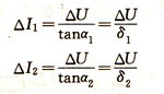 也可以把以上分析用公式加以定量地表達(dá),為此,假定兩并聯(lián)發(fā)電機(jī)具有如圖9.19所示的特性1和特性2,它們的調(diào)差率分別為δl=tanα1和Δ2=tanα2,空載電壓分別為U1和U2。假定在某一負(fù)載I∑下,發(fā)電機(jī)的實(shí)際電壓為U0。顯然,電站的無(wú)功負(fù)載I∑與電壓U的關(guān)系可表示為