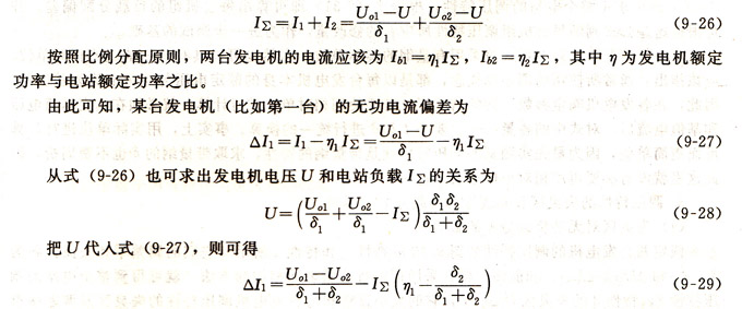 。式(9-29)則給出了發(fā)電機(jī)的無(wú)功電流偏差和各機(jī)組調(diào)壓特性及電站無(wú)功負(fù)載的關(guān)系。比如,令I(lǐng)Σ=0代入式(9-29),就得到發(fā)電機(jī)空載并聯(lián)后的無(wú)功環(huán)流;給出I∑后,令△I=O,則可求出此I∑工況下,為了滿足無(wú)功負(fù)載均衡分配所需要的空載電壓(若為已知)。當(dāng)然,也可在其他條件已知的情況下,求出所需要的調(diào)差度。