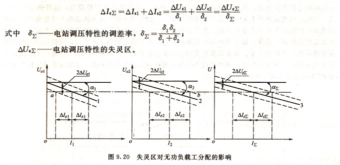 從圖9. 20的調(diào)壓特性可以看出,當(dāng)電站的無功負(fù)載為IΣ時(shí),電站的電壓可能是U±△UεΣ間的任意值,另一方面,對任何一個(gè)電站電壓U,來說,每臺發(fā)電機(jī)的無功電流,也可能是I1±△Iε1和I2士△Iε2范圍內(nèi)的任意值,其中
