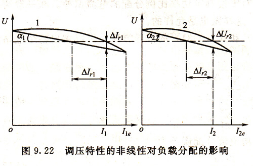并聯(lián)運行的發(fā)電機中有一臺具有無差特性,只能說在一定條件下是可行的,如圖9. 21中特性1是無差的、特性2是有差的,整個電站的特性3也是無差的(為了簡單,各特性的失靈區(qū)均未繪出),具有特性2的發(fā)電機總是以固定的電流,2(在土Ale2的精度范圍內)運行,對于任何負載電流I∑來說,無差特性發(fā)電機的無功電流為I1=I∑- I2。對于I∑變化不大的電站,采用一臺機組承擔基本負載,另一臺機組承擔浮動性負載,以獲得電壓嚴格穩(wěn)定,這樣做也是可行的。當然,這里就談不上無功負載嚴格均衡分配了。任何調壓器的失靈區(qū)總是不可避免的,也就是說調壓特性的失靈區(qū)總是存在的。為了提高無功負載分配的精度,應該盡量減小失靈區(qū),采用靈敏度較高的調壓裝置,如半導體晶閘管調壓系統(tǒng),可控相復勵調壓系統(tǒng)等,同時還應該保證調壓特性具有一定的調差率。增大調差率固然對功率分配有利,但調差率代表了發(fā)電機從空載到額定無功負載的電壓變化幅度,調差率過大顯然對維持電壓穩(wěn)定是不利的。多數標準規(guī)定相對調差率δ*不應大于2.5%—3.5%。