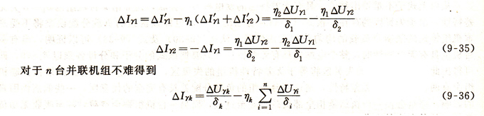 前面的式(9-31)給出了ε=0和γ=0時無功電流分配偏差的計算式,為了考慮失靈區(qū)和非線性的影響,當然還要加上按式(9-34)和式(9-36)計算出的電流偏差值。將式(9-31)、式(9-34)、式(9-36)加以綜合,就可以得到估算每臺發(fā)電機無功電流偏差的通式,即