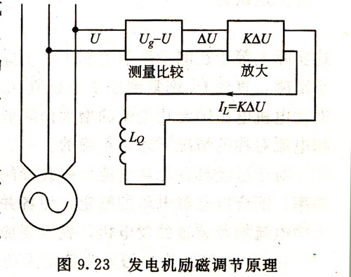 圖9. 23是這種調(diào)壓器的原理圖,為了便于分析,把調(diào)壓器的測量比較環(huán)節(jié)單獨框出,這一環(huán)節(jié)的作用原理,是將輸入的發(fā)電機端電壓經(jīng)過一定變換后(比如變壓、整流),與某一給定數(shù)值(比如某一穩(wěn)壓管電壓)進行比較,然后輸出一個與發(fā)電機電壓偏差成正比的信號AU。調(diào)壓器輸出的勵磁電流則在一定范圍內(nèi)和這一電壓偏差信號成正比。屬于這一類型的調(diào)壓裝置很多,如各種晶閘管調(diào)壓器、帶校正器的自勵恒壓裝置、炭阻式調(diào)壓器等。但是,如果僅僅為了討論無功負載分配問題,則只要把握住這類調(diào)壓器的輸入(測量環(huán)節(jié))和輸出(勵磁電流)之間的基本規(guī)律,便可不去深究那些種類繁多、關(guān)系復雜的中間環(huán)節(jié)。一般地說,做到這點也并不困難。