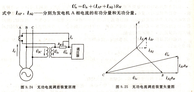 圖9. 24是無功電流調(diào)差裝置的原理圖。它的特點就是在被檢測的發(fā)電機線電壓上(如圖中的Ubc),疊加一個與第三相電流(IA)成正比的電壓量,這也是檢測無功電流的一般方法。其作用原理如下:若忽略測量回路電流在Rw上的壓降,當發(fā)電機空載時(IA=0),假定加在測量元件上的輸入電壓U′bc=U′bc0,而當發(fā)電機具有電流IA時,則測量元件的輸入電壓為