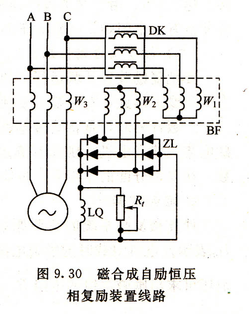 圖9.30是磁合成的自勵(lì)恒壓線路圖,圖中DK為三相線性電抗器,又稱移相電抗器;BF為三相三繞組變壓器,W1為BF的電壓繞組,W2為輸出繞組,W3為其電流繞組;ZL為三相橋式整流器,忌為調(diào)整變阻器,LQ為發(fā)電機(jī)的勵(lì)磁繞組。