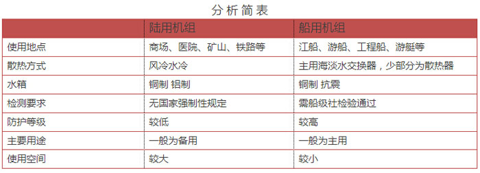 此外,船用機(jī)組分主機(jī)和輔機(jī),大多數(shù)情況要求多機(jī)并聯(lián),陸用機(jī)組視具體情況相對(duì)簡(jiǎn)單,兩者使用條件也不一樣,船用發(fā)電機(jī)組是在內(nèi)陸河流或海洋上運(yùn)行使用,因此防水、防潮、防鹽堿、抗沖擊、抗顛簸的能力有強(qiáng)制要求。