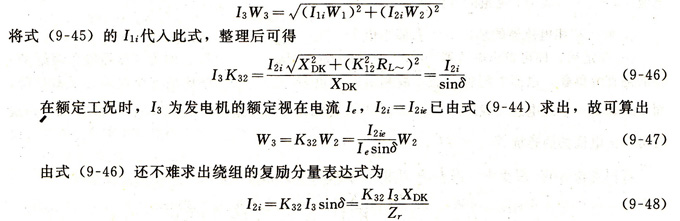 將式(9-43)和式(9-48)加以合并,就可得到復(fù)勵(lì)變壓器輸出電流的完整表達(dá)式。不過要注意,電壓分量I2o已經(jīng)在相位上滯后發(fā)電機(jī)電壓δ角(δ≈90°),也即I2o和I2i的相位關(guān)系應(yīng)該和圖9.31(a)所表示的相一致。考慮到這一特點(diǎn),發(fā)電機(jī)的勵(lì)磁電流可表示為